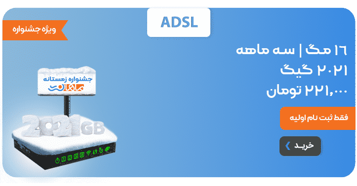 در جشنواره زمستانه ماهان نت می توانید 2021 گیگ اینترنت پرسرعت سه ماهه ADSL را فقط با 221هزار تومان خریداری کنید! *سرعت این سرویس تا 16 مگابیت برثانیه است. *